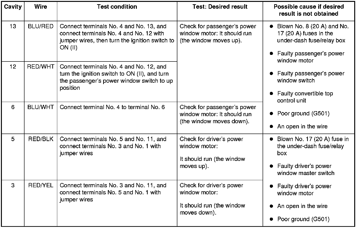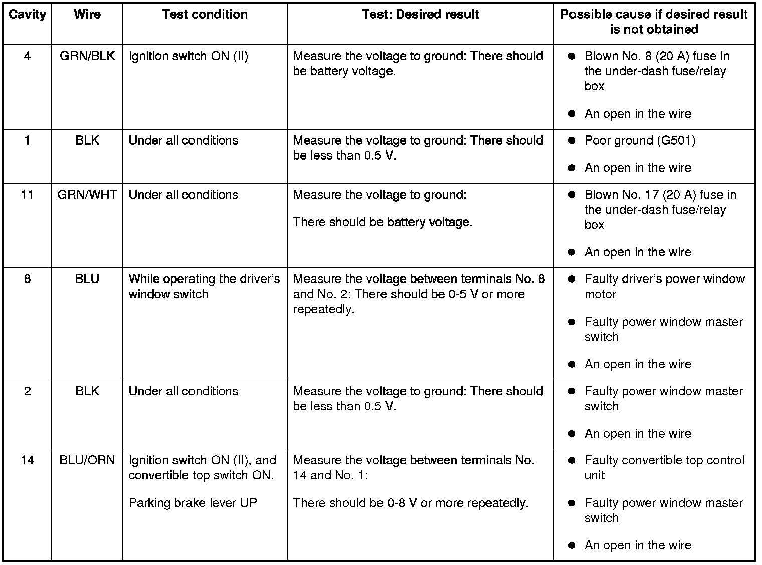 5. Reconnect the connector to the power window master switch, and do these input tests at the following connector.