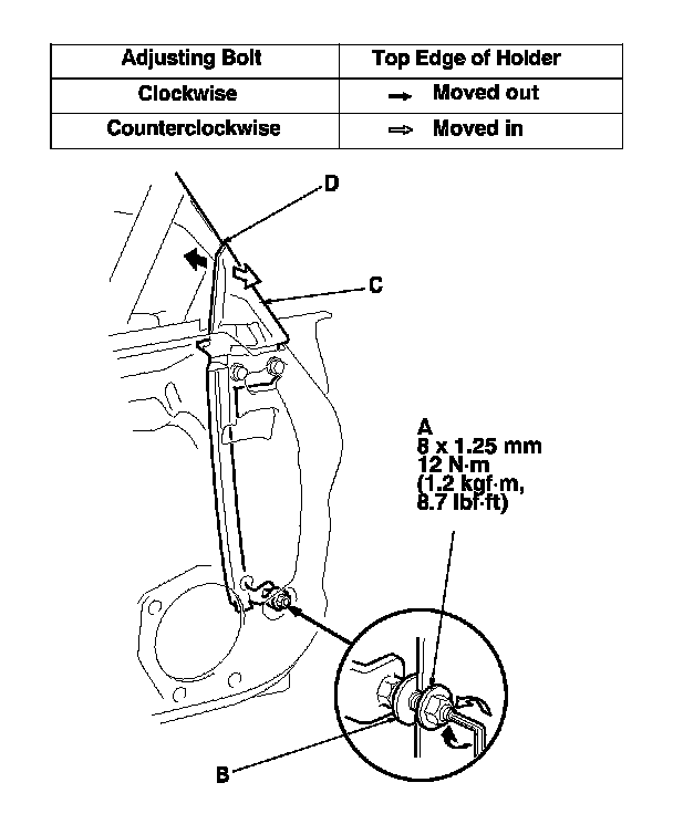 4. Align the door sash holder (C) with the glass using the adjusting bolt at the bottom of the holder. Make sure that there is no clearance between the end of the channel (D) and the glass surface.