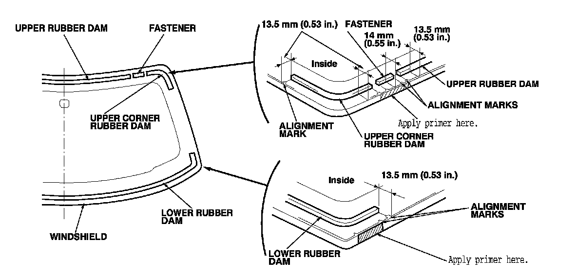 - To attach the molding, apply primer to the areas between the alignment marks of the windshield.