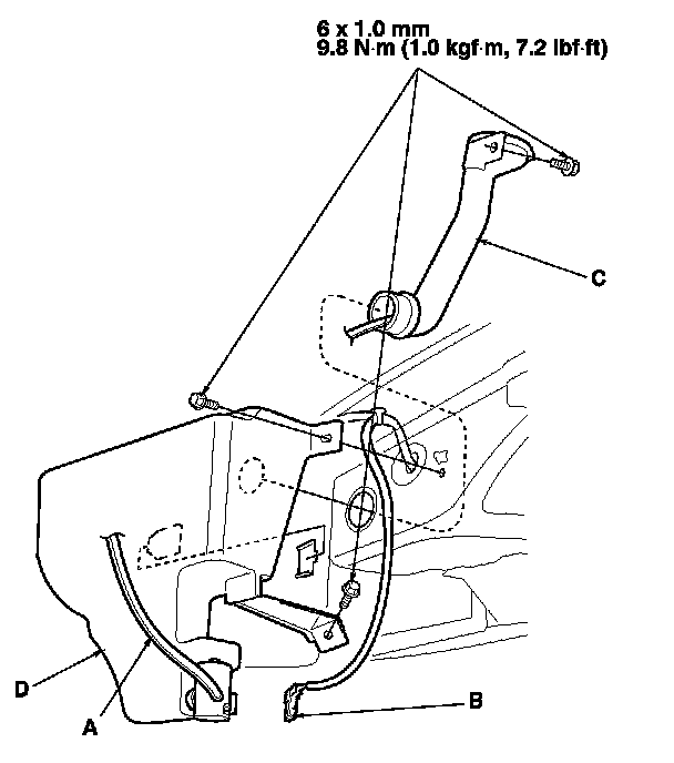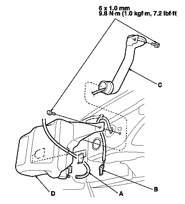 3. Remove the bolts, then separate and remove the filler neck (C) from the washer reservoir (D).