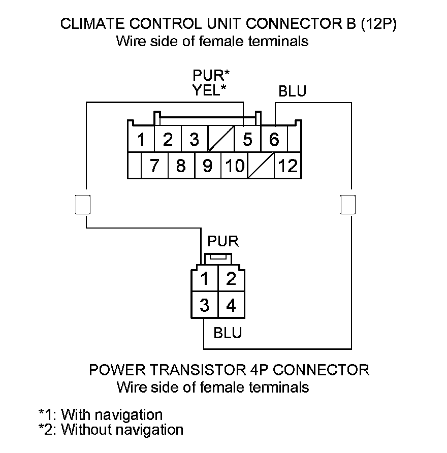 Check for loose wires or poor connections at the climate control unit connector B (12P) and at the power transistor 4P connector. If the connections are good, substitute a known-good climate control unit, and recheck. If the symptom/indication goes away, replace the original climate control unit (with navigation) Climate Control Unit Removal/Installation (With Navigation), (without navigation) Climate Control Unit Removal/Installation (Without Navigation).�