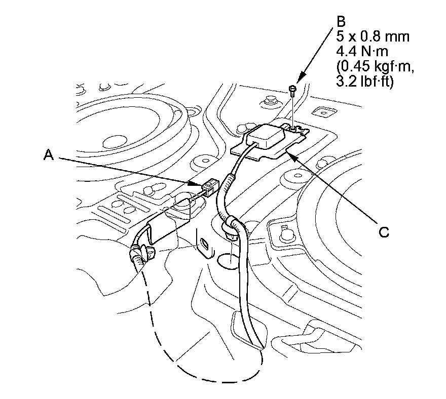 2. Disconnect the GPS antenna connector (A), and remove the bolt (B).