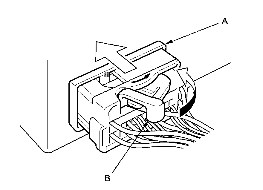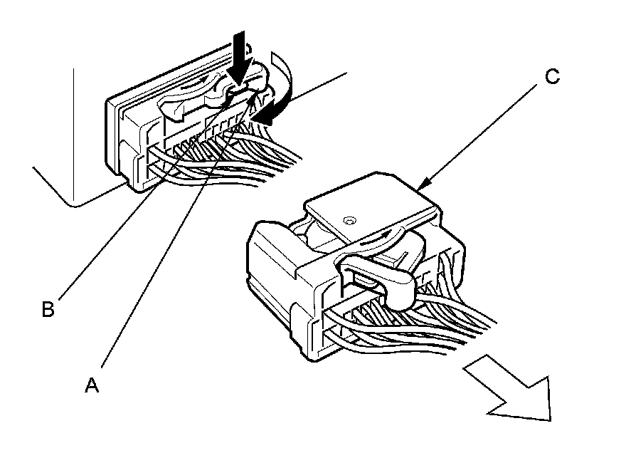 To disconnect the connector, pull the lever (A) while pushing the lock tab (B) down, then pull the connector (C).