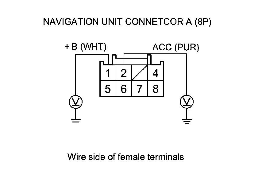 5. Measure the voltage between body ground and navigation unit connector A (8P) terminals No. 1 and No. 2 individually.