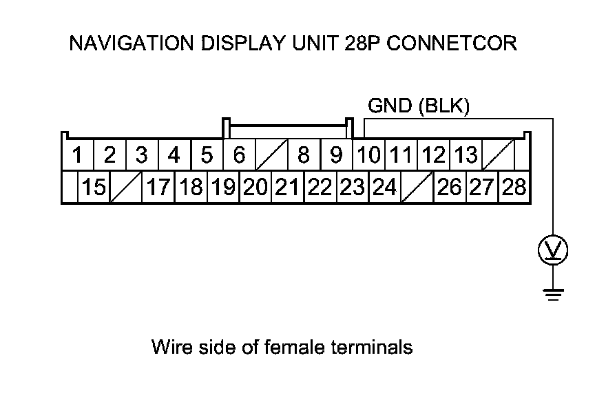 8. Measure the voltage between navigation display unit 28P connector terminal No. 10 and body ground.
