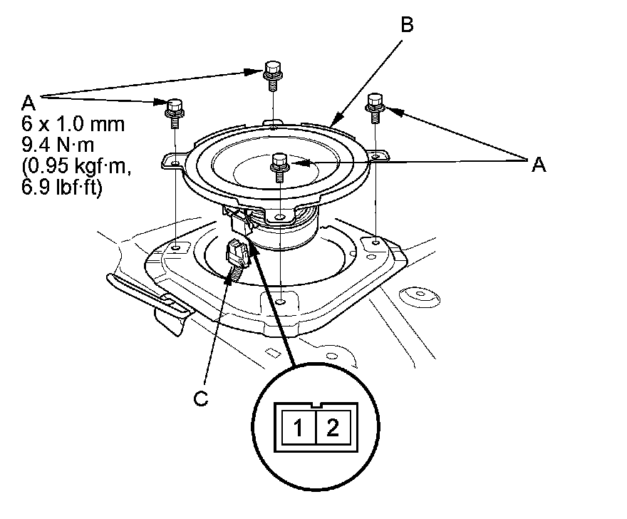 3. Disconnect the 2P connector (C), and remove the rear speaker.
