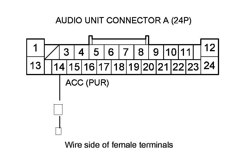 5. Measure the voltage between audio unit connector A (24P) terminal No. 14 and body ground.