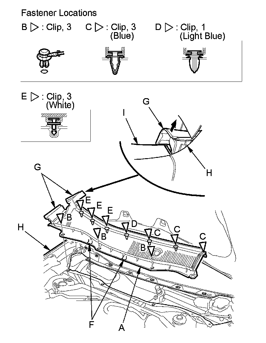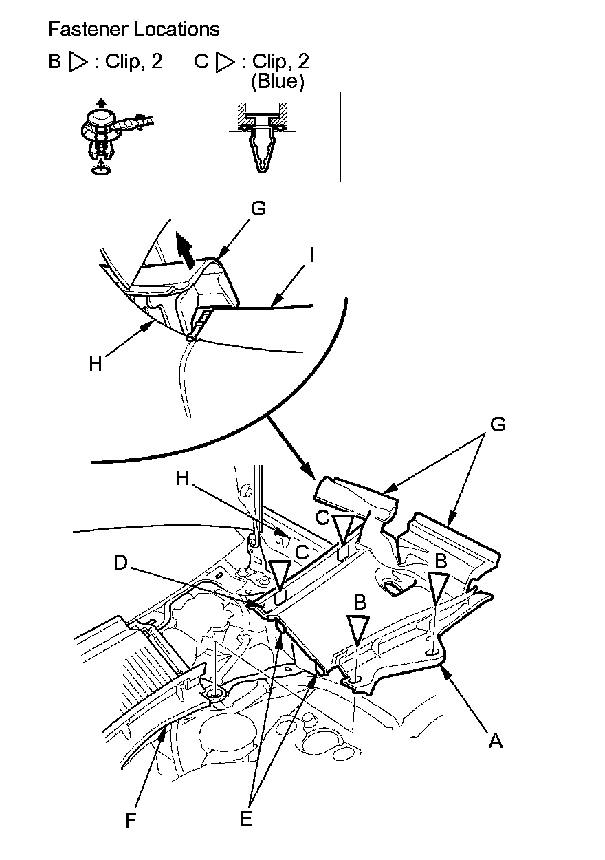 4. Release the edges of the hood hinge cover (G) from the front fender (H), and release the hinge cover from the roof molding (I).
