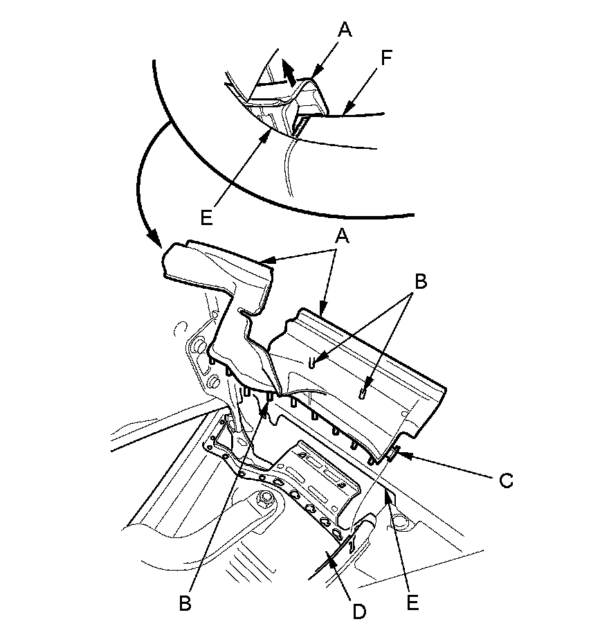 2. Release the edges of the hinge cover from the front fender (E), and release the hinge cover from the roof molding (F).
