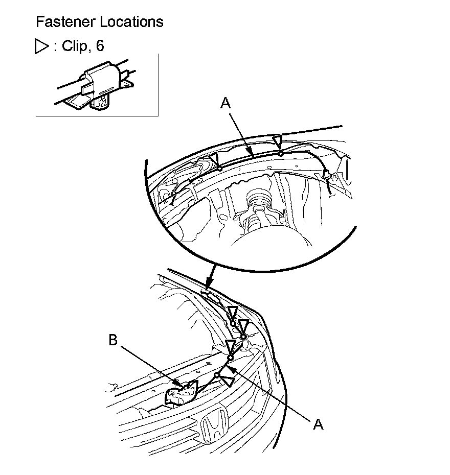 4. Disconnect the hood opener cable (A) from the hood release handle (B) Hood Release Handle Replacement.