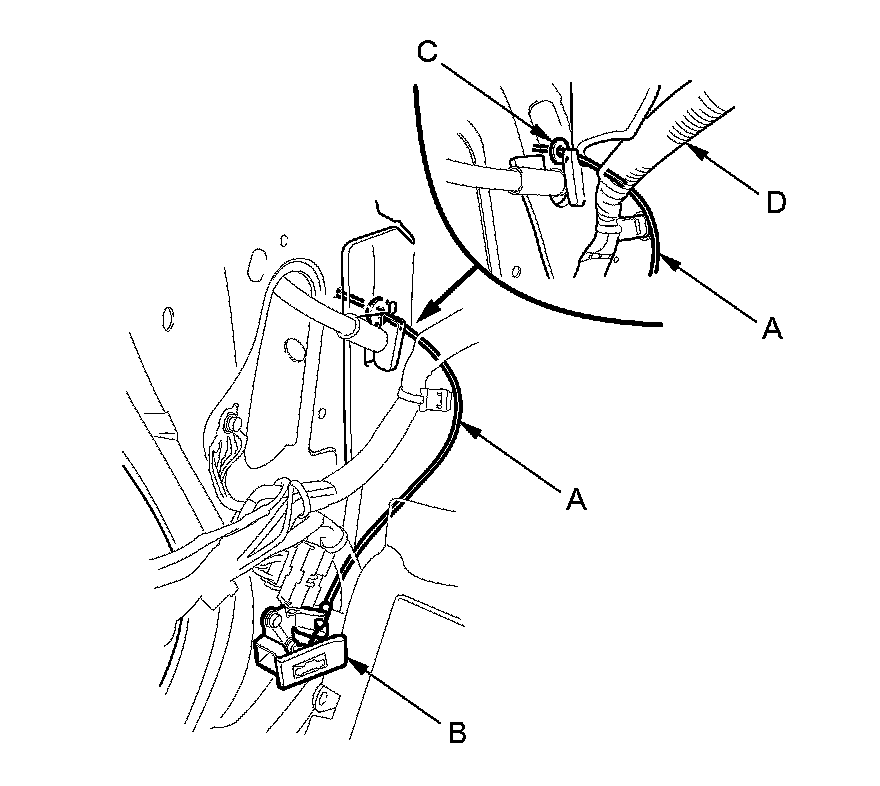 - When installing the opener cable under the dashboard, route the cable under the left engine compartment wire harness (D).