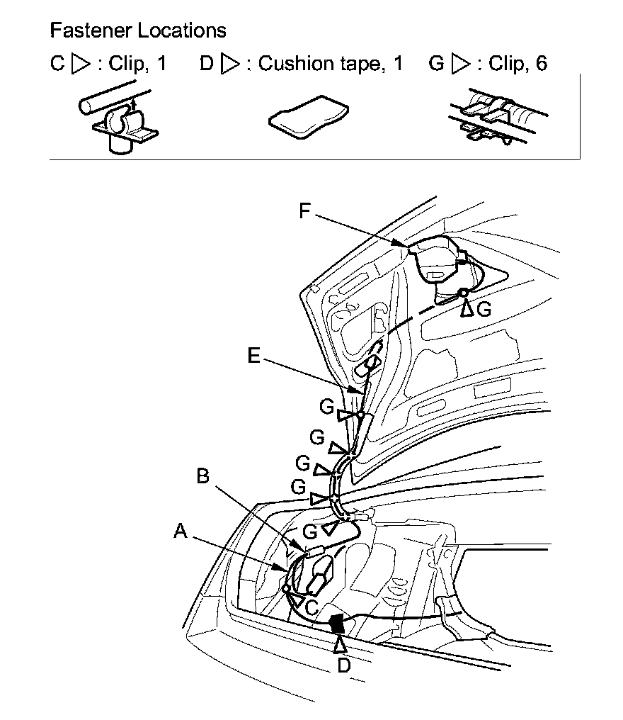 - Align the marks (A) on the opener cable (B) with the cable clips (C) and the cushion tape (D) as shown.