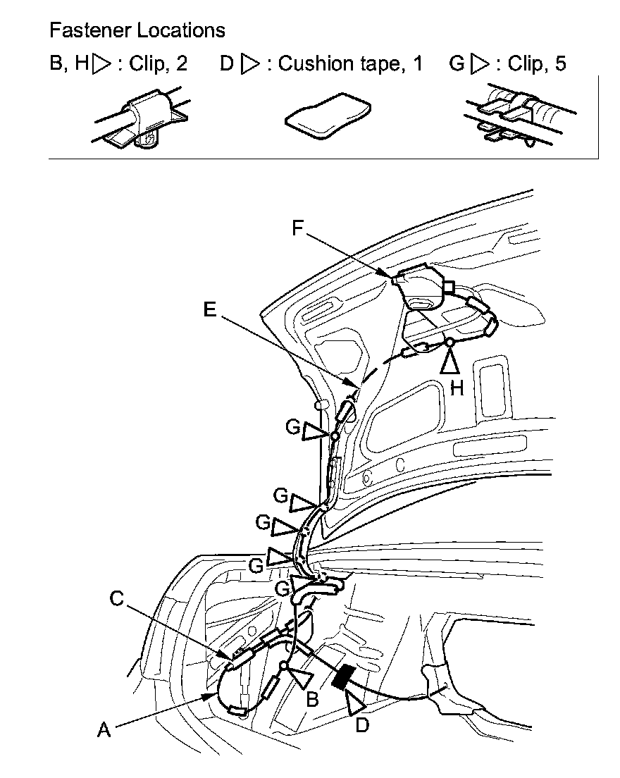 3. Release the trunk lid opener cable from the clips (G), and detach the clip (H).