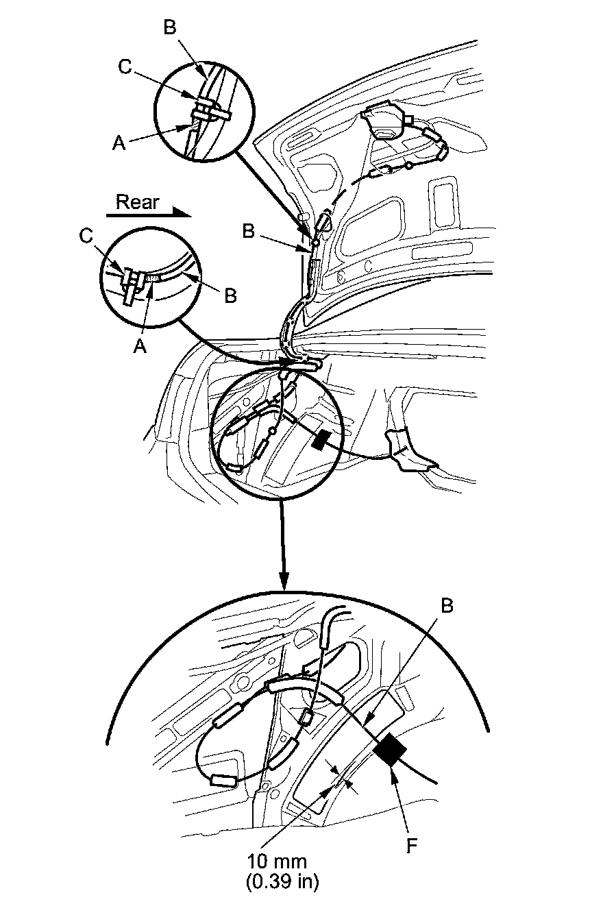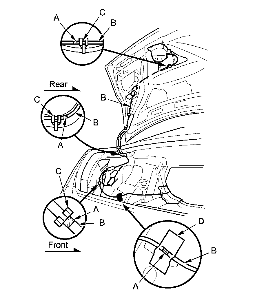 2. Release the trunk lid opener cable/fuel fill door opener cable from the clip (C), and remove the cushion tape (D).