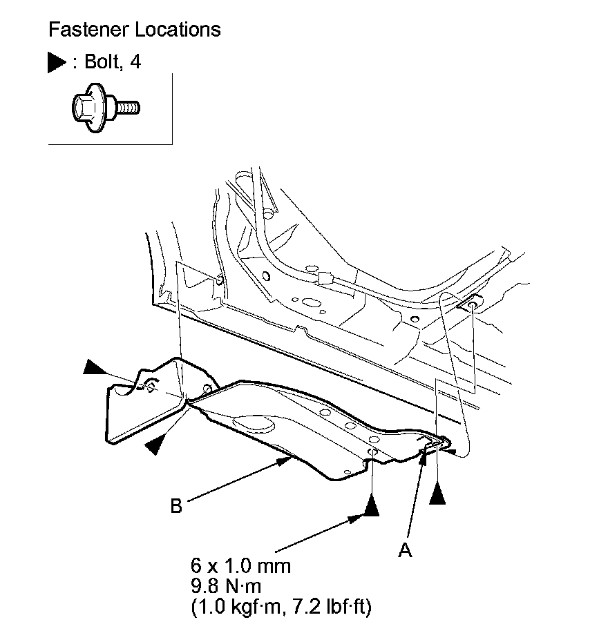 1. Remove the bolts and release the hook (A), then remove the left middle floor undercover (B).