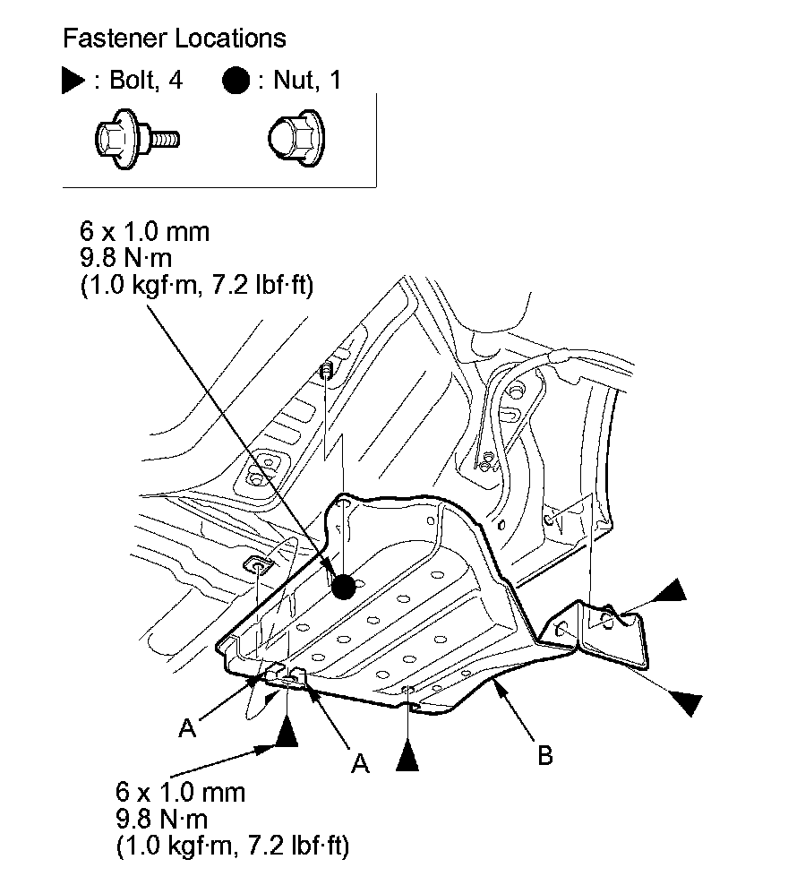 1. Remove the bolts and the nut, and release the hooks (A), then remove the right middle floor undercover (B).