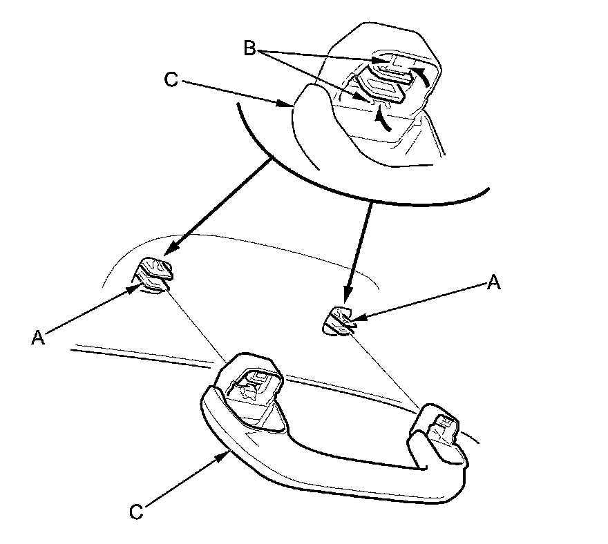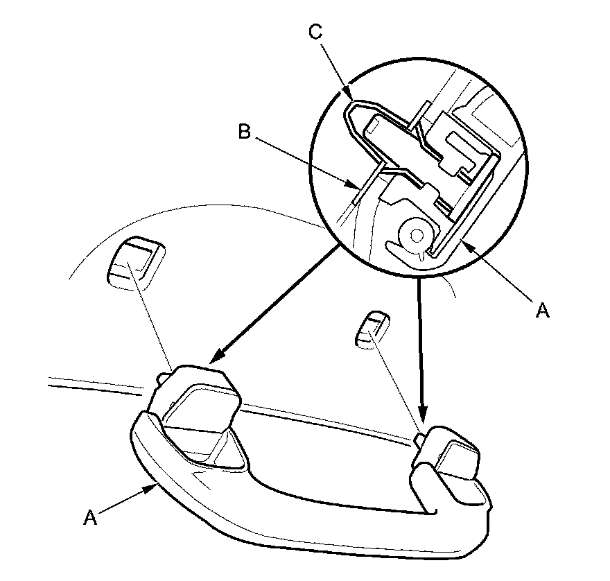 8. Position the grab handle (A) on the grab handle bracket (B), and push on the grab handle until the clips (C) snap into place securely.