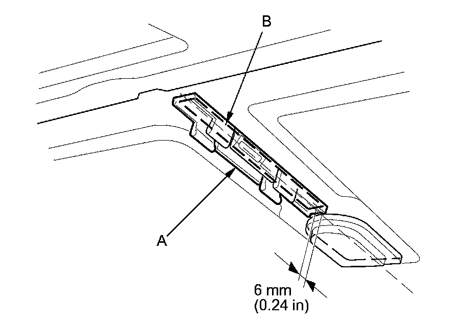 6. Attach the rearview mirror harness cover base (A) with adhesive tape (B) to the inside face of the windshield as shown, then press adhesive areas into place securely.