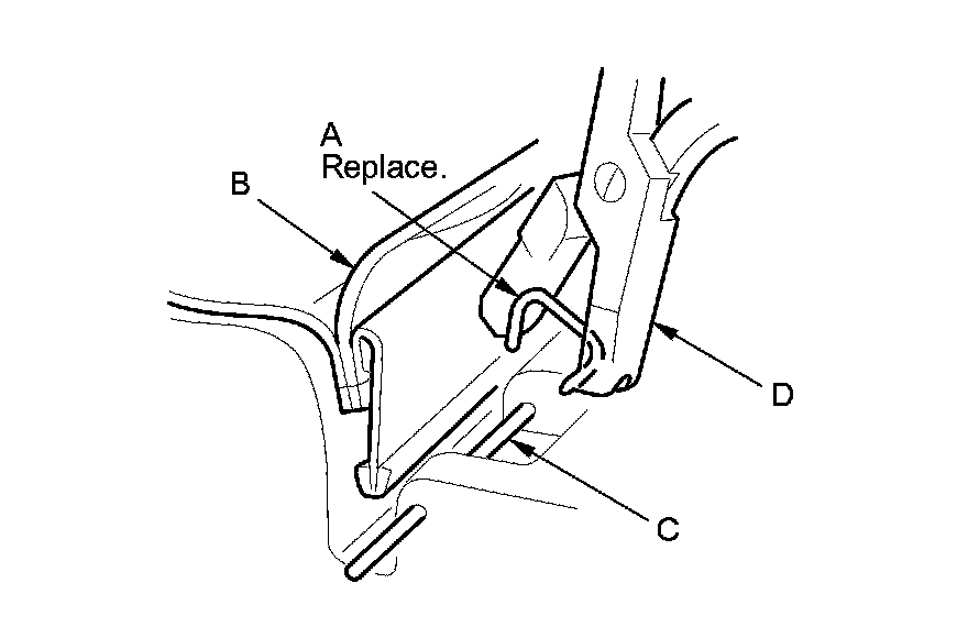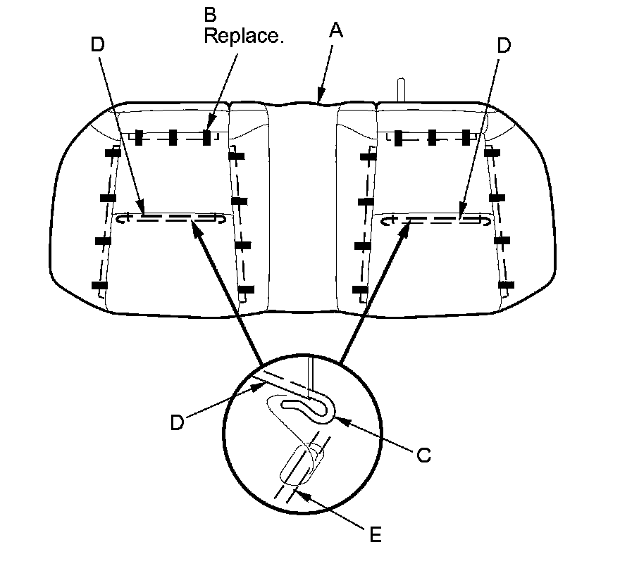 - Replace all of the upholstery rings (A) fastening the seat cushion cover (B) to the pad wires (C) with new ones using commercially available upholstery ring pliers (D).