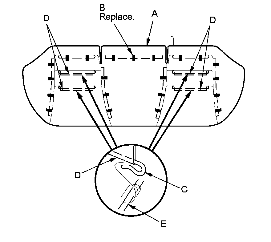 3. Pull back the edge of the seat cushion cover (A) all the way around, and release the upholstery rings (B), and release the hooks (C) of the lateral wires (D) from the longitudinal wires (E) on the pad, then remove the seat cushion cover.
