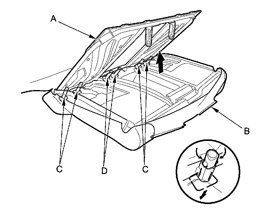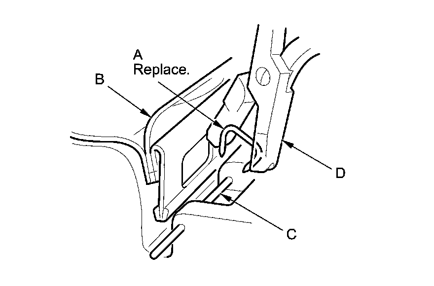 - Replace all of the upholstery rings (A) fastening the seat-back cover (B) to the pad wires (C) with new ones using commercially available upholstery ring pliers (D).