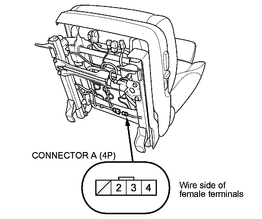 7. Check for continuity between seat heater connector A (4P) terminals No. 2 and No. 3, and terminals No. 3 and No. 4. There should be continuity.