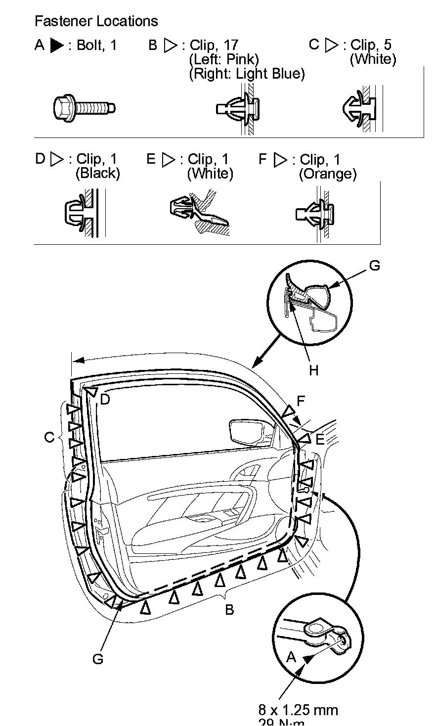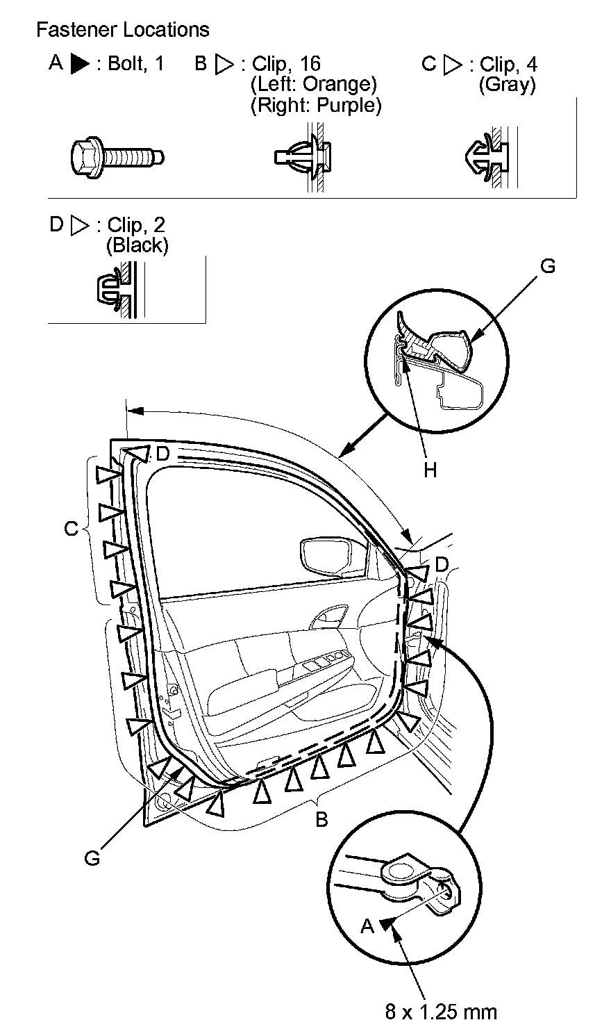 2. Detach the clips (B, C, D, E, F), and release the door weatherstrip (G) from the holder (H) of the door sash, then remove the weatherstrip.