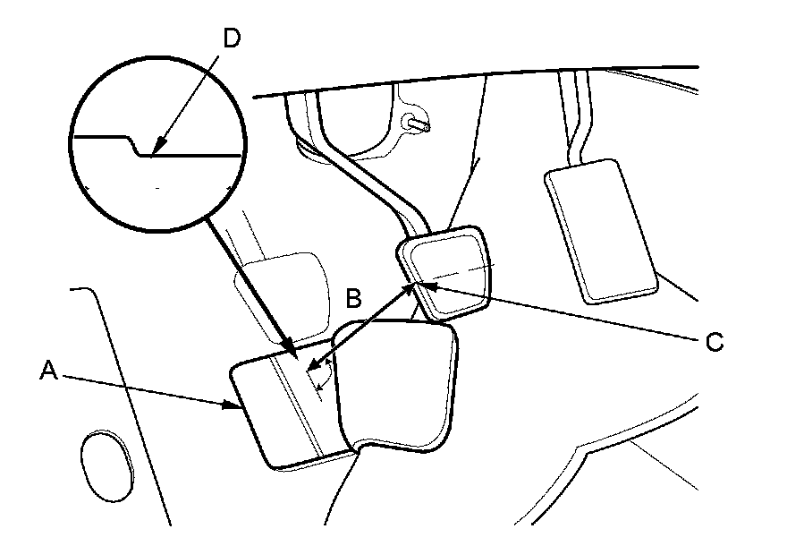 3. Pull back the carpet, and find the cutout (A) in the insulation. Measure the pedal height (B) from left side middle of the brake pedal pad (C) to the floor (D) without the insulation as shown.