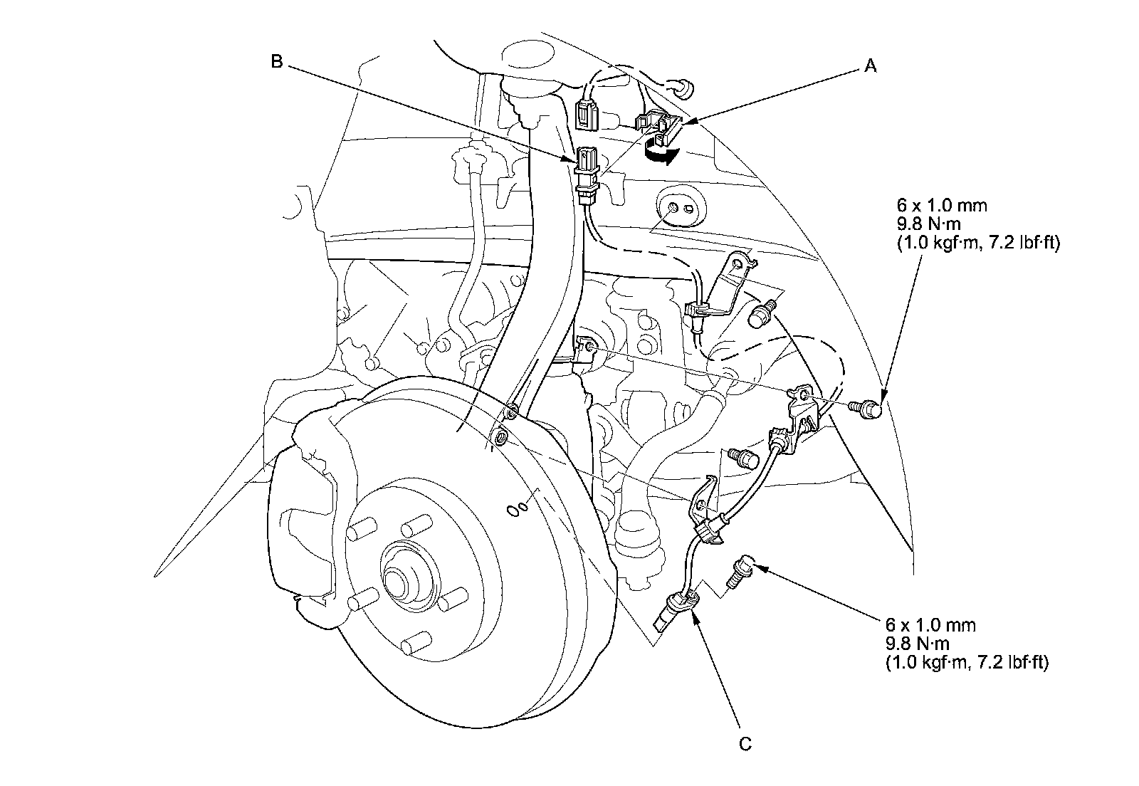 3. Remove the clamps, the bolt, and the wheel speed sensor (C).