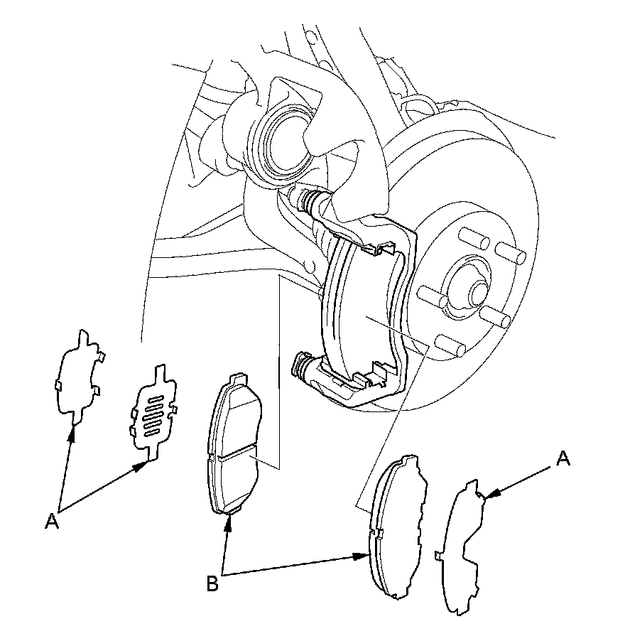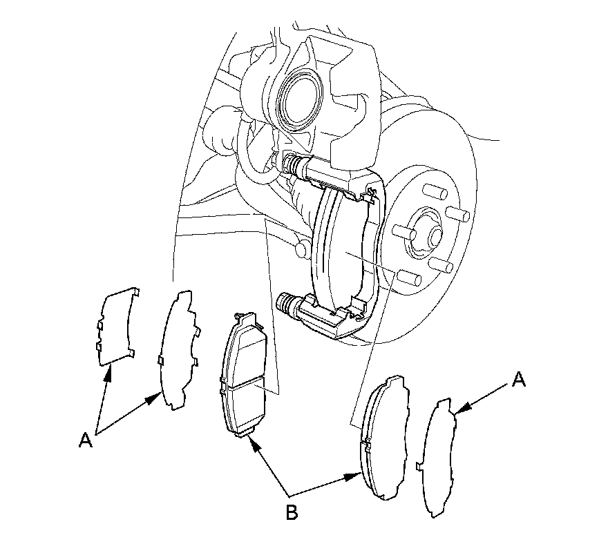 5. Check the thickness (A) of the inner pad (B) and the outer pad (C). Do not include the thickness of the backing plate.