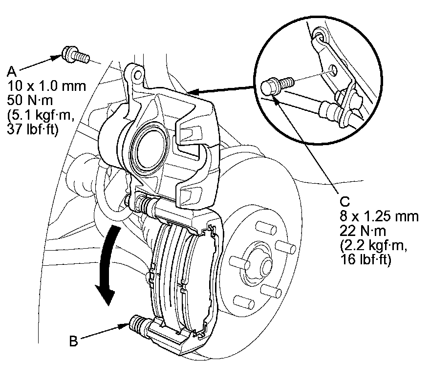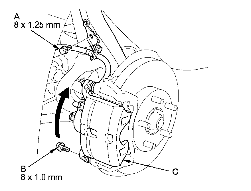 5. Remove the flange bolt (B), and pivot the caliper (C) up out of the way. Check the hose and the pin boots for damage and deterioration.