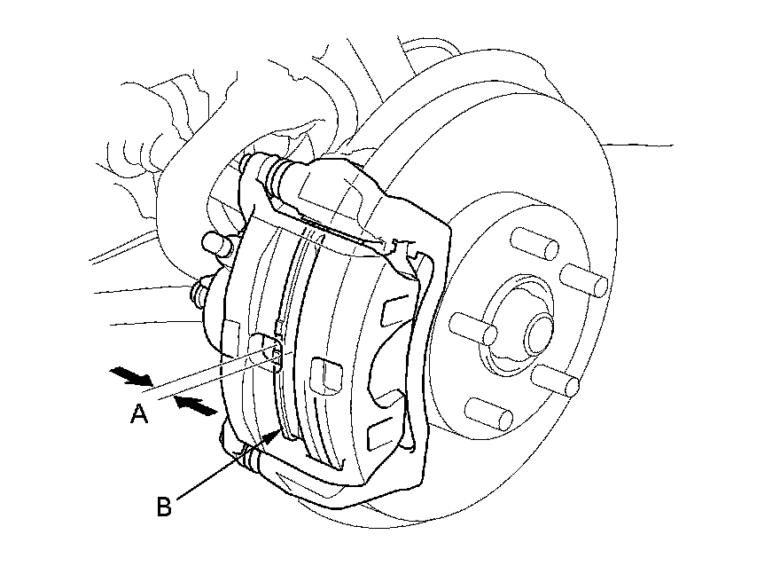 8. Clean the caliper bracket (B) thoroughly; remove any rust, and check for grooves and cracks. Verify that the caliper pins (C) move in and out smoothly. Clean and lube if needed.