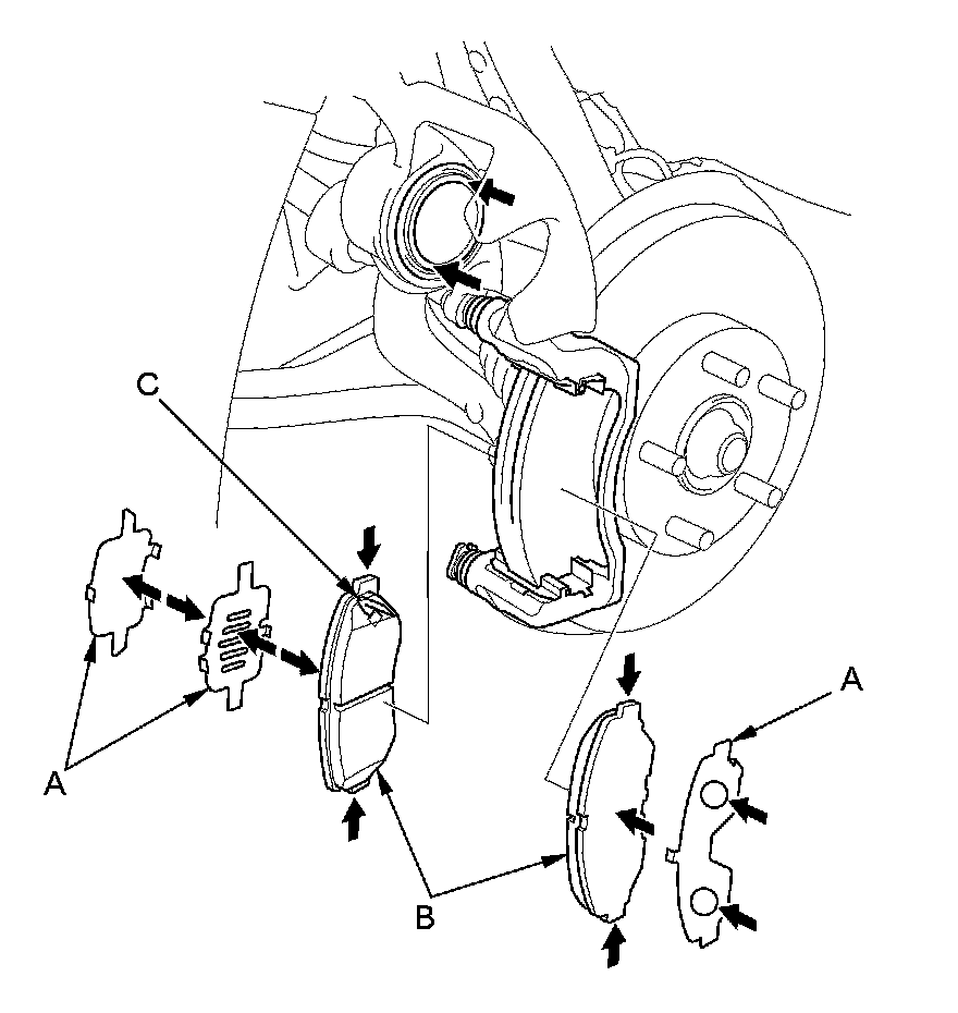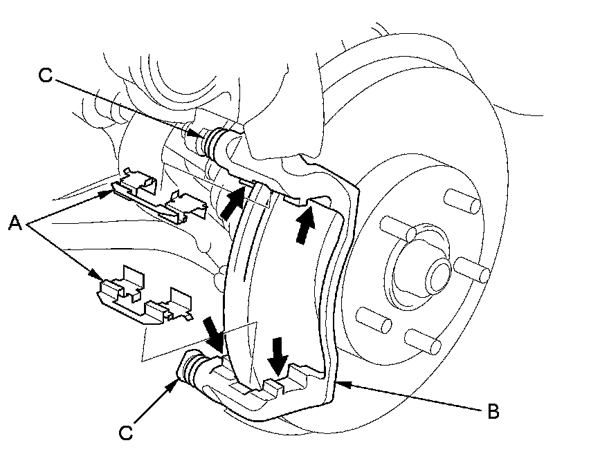 16. Install the brake pads and the pad shims correctly. Install the brake pad with the wear indicator (C) on the upper inside. If you are reusing the brake pads, always reinstall the brake pads in their original positions to prevent a temporary loss of braking efficiency.
