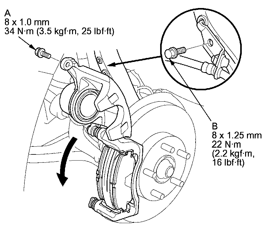 17. Pivot the caliper down into position. Install the flange bolt (A), and tighten it to the specified torque while holding the caliper pin (B) with a wrench being careful not to damage the pin boot.