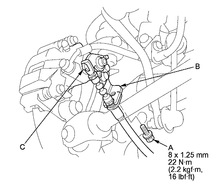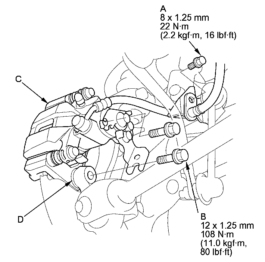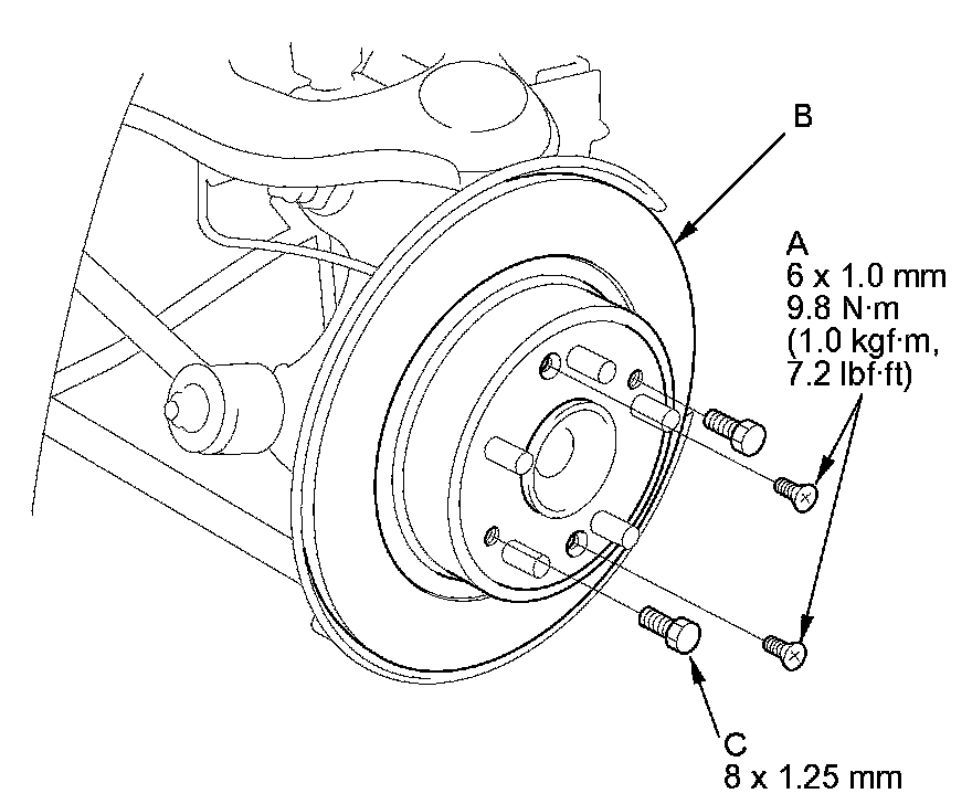 NOTE: If the brake disc is stuck to the hub bearing unit, thread two 8 x 1.25 mm bolts (C) into the brake disc to push it away from the hub bearing unit. Turn each bolt 90 degrees at a time to prevent the brake disc from binding.