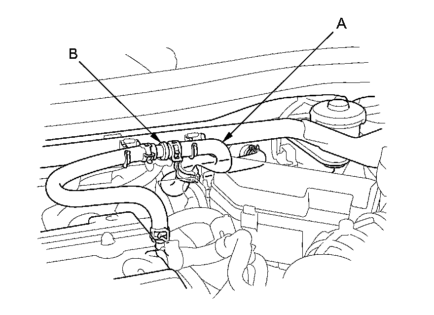3. Disconnect the brake booster vacuum hose (A) at the booster. The check valve (B) is built into the hose.