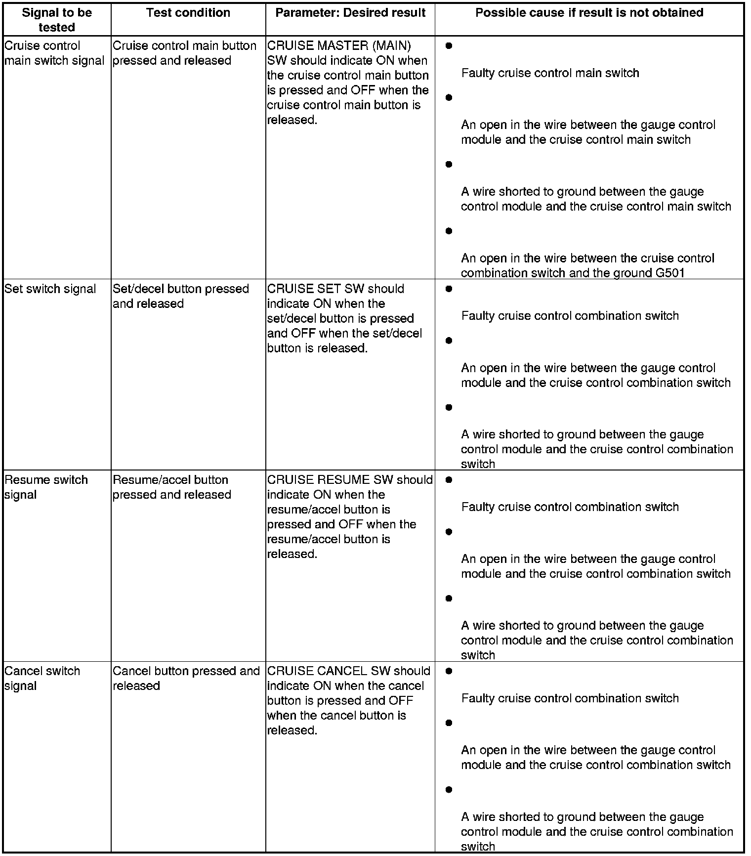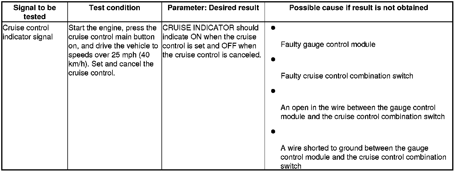 NOTE: Intermittent failures are often caused by loose circuit connections. While monitoring cruise control inputs, flex the circuit wires, and note if any of the test results change.