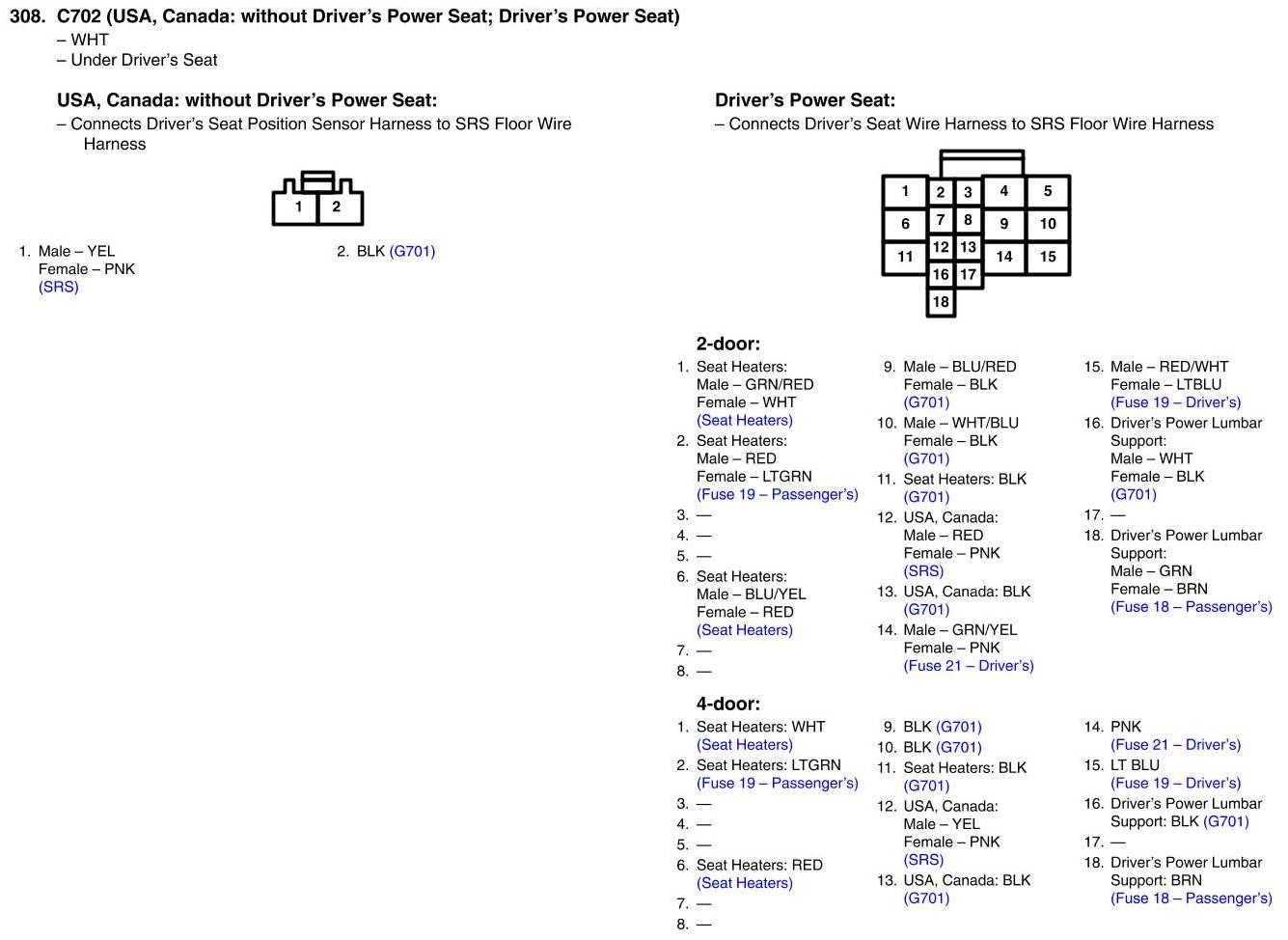View 308 - C702 Connector View (USA, Canada: Without Driver's Power Seat; Driver's Power Seat)