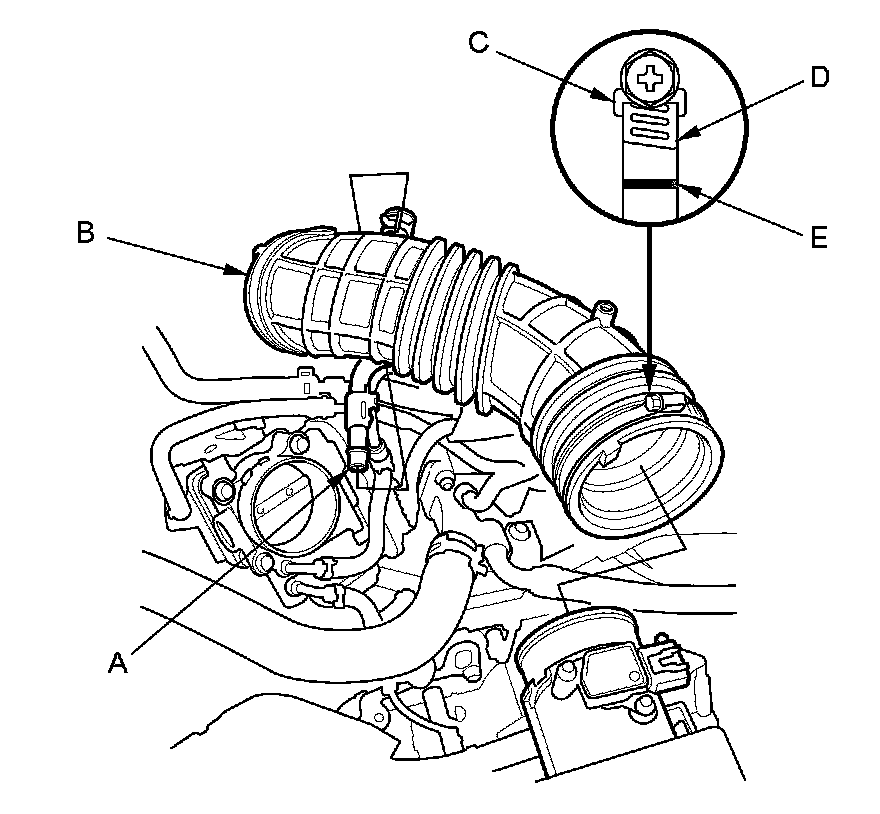 NOTE: When tightening the screw of the hose band (C), align the edge of the hose band (D) with the mark (E) painted on the hose band. If you tighten the screw over the mark, replace the hose band.