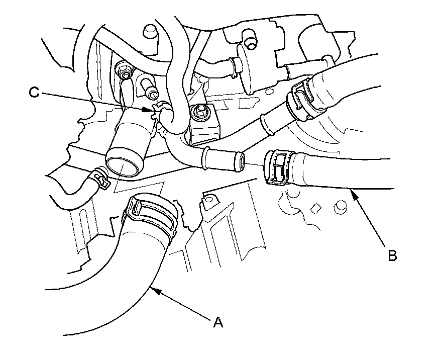 3. Disconnect the upper radiator hose (A), the heater hose (B), and the water bypass hose (C).