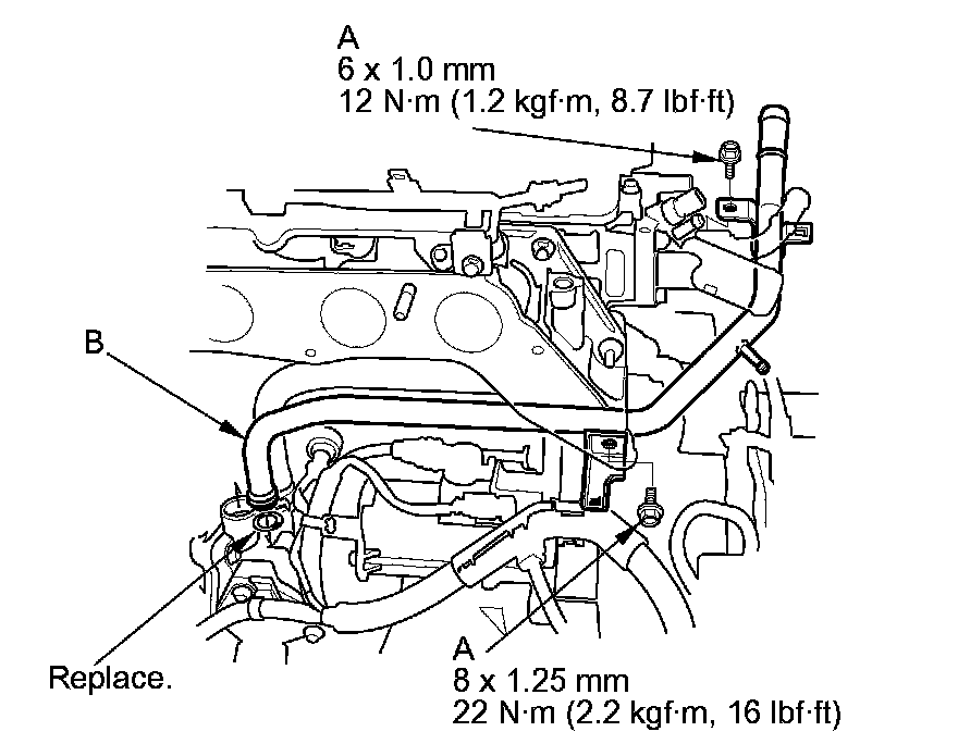 5. Remove the connecting pipe mounting bolts (A), then remove the connecting pipe (B).