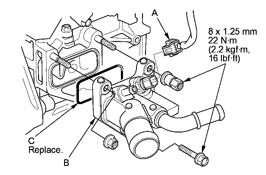 7. Install the water outlet with a new O-ring (C).