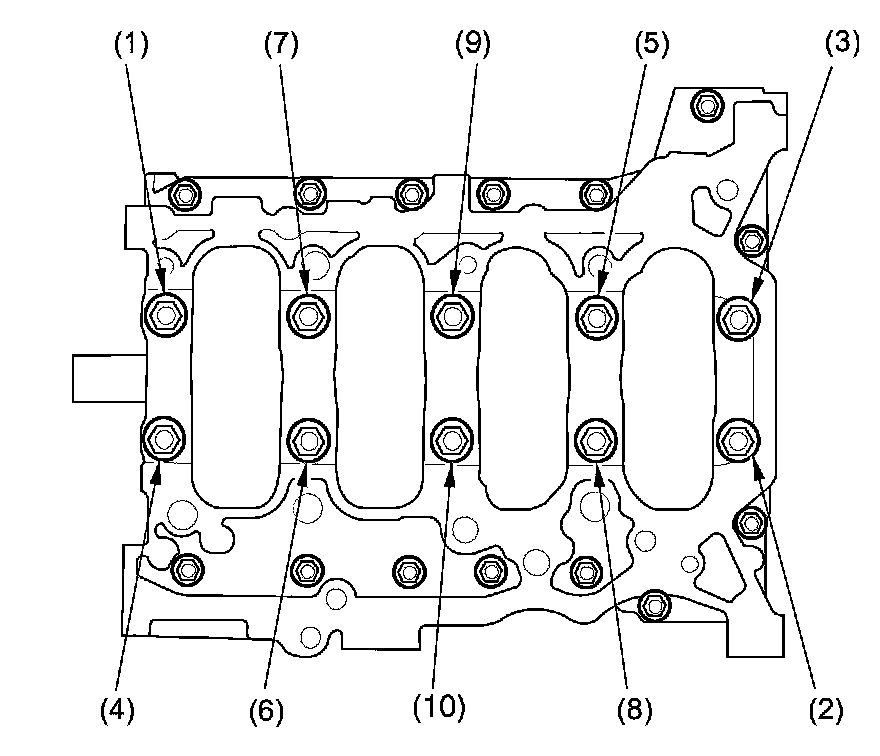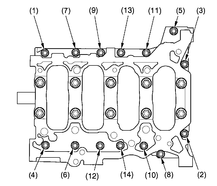 12. Remove the bearing cap bolts. To prevent warpage, loosen the bolts in sequence 1/3 turn at a time; repeat the sequence until all bolts are loosened.