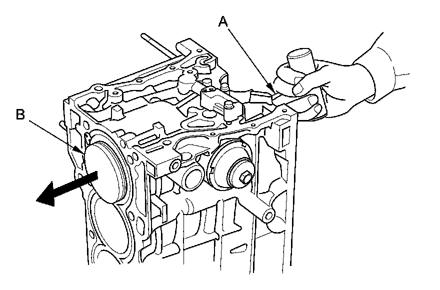 19. Use the wooden handle of a hammer (A) to drive out the piston/connecting rod assembly (B).