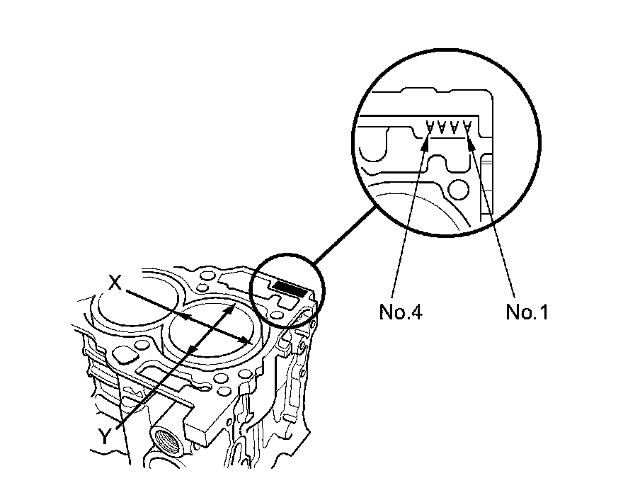 4. Measure the wear and taper in direction X and Y at three levels inside each cylinder as shown. If measurements in any cylinder are beyond the oversize bore service limit, replace the engine block. If the engine block is being rebored, refer to step 7 Testing and Inspection after reboring.