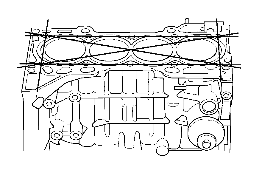 6. Check the top of the engine block for warpage. Measure along the edges and across the center as shown.