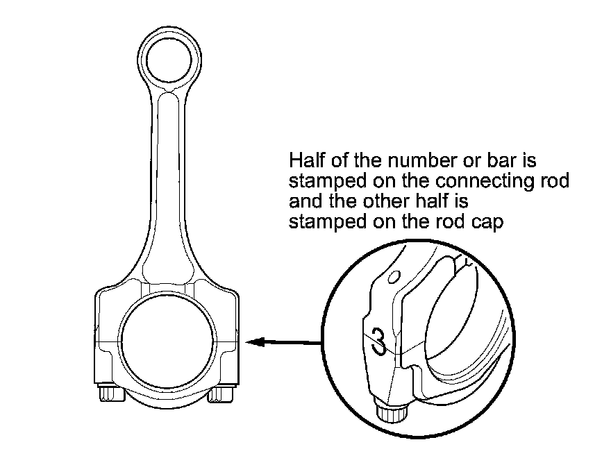 2. Each connecting rod has a tolerance range from 0 to 0.024 mm (0.00094 in), in 0.006 mm (0.00024 in) increments, depending on the size of its big end bore. It is then stamped with a number or bar (1, 2, 3, or 4/I, II, III, or IIII) indicating the range. You may find any combination of numbers and bars in any engine. (Half the number or bar is stamped on the rod cap, the other half is on the rod.)