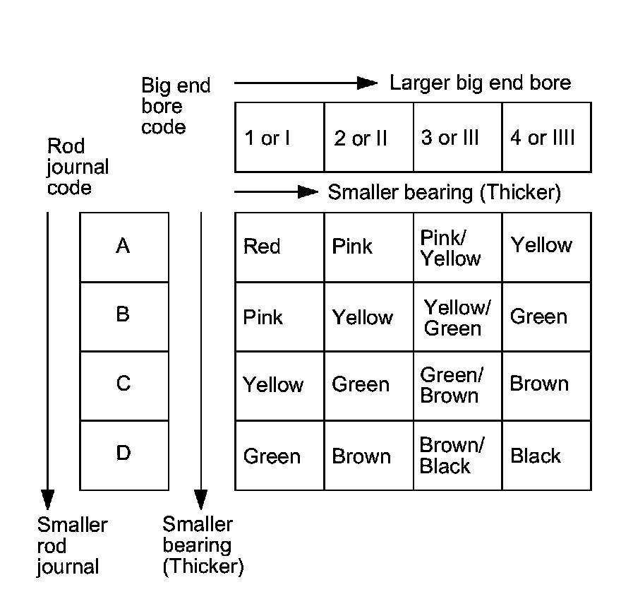 4. Use the big end bore codes and the rod journal codes to select appropriate replacement bearings from the following table.