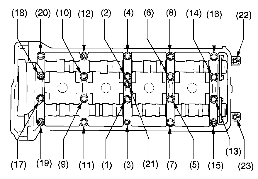 10. Install the camshaft holders, then tighten the bolts to the specified torque as shown in step 4.