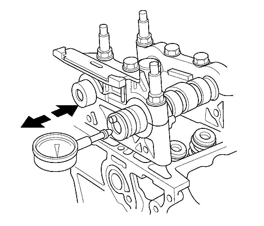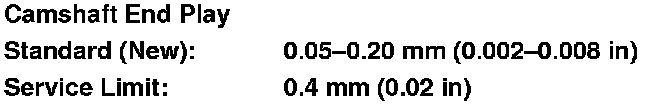 6. Zero the dial indicator against the end of the camshaft, then push the camshaft back and forth, and read the end play. If the end play is beyond the service limit, replace the cylinder head and recheck. If it is still beyond the service limit, replace the camshaft.